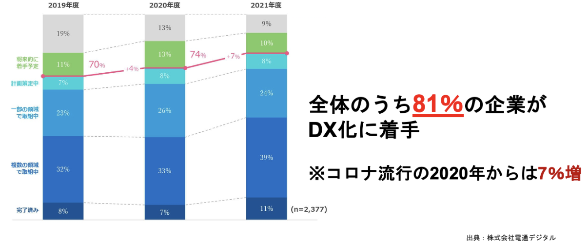 上図のように2021年からは81%もの企業が既に着手していることからもDX化を進めていくことが肝要であることがわかります。