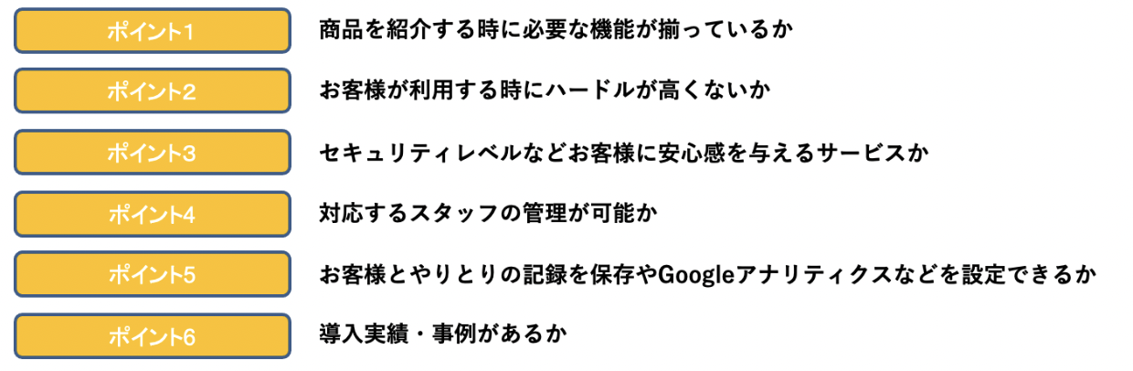 上から説明すると、商品・サービスを紹介するのにそもそも対応できる機能がないとあまり意味のないものになってしまいます。ツールの機能をきちんと把握して、商品・サービスを紹介できるものか確認をしてください。 次に、お客様が利用する時の心理的ハードルが高くないかということです。導入したとしてもお客様側が使うための方法がわからず、結局流入してこないとなると、こちらも意味をなしません。オンライン接客の実施導線も含めて適するものか判断しましょう。 他にもポイントをあげてますので、これらをチェックしてツールの導入検討をするようにしましょう。