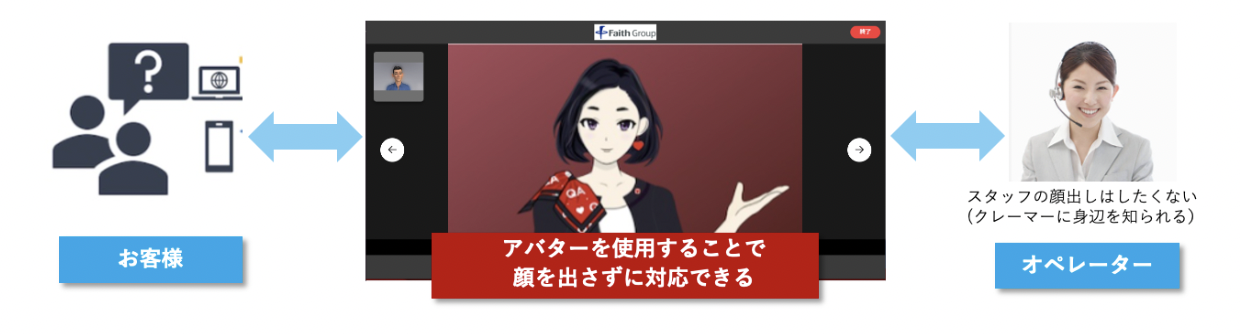 ツールによってはオペレーターアバター化することにより、接客中としても顔を出すことなく対応できるので、悪質なクレーマーから守ることができます。 また、お客様もアバターと会話する形になるので、コミュニケーションの心理的ハードルを下げて会話する効果が見込めます。