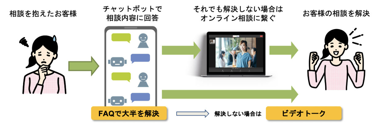 テキストチャットとビデオチャットを併用利用することで、チャットボットのFAQで大半の相談を解決し、対応スタッフの手間を軽減することが可能です。 解決しない・FAQの回答がマッチしない相談のお客様にはオンラインで細かな対応することもでき、課題の内容が浅い深いにかかわらず全方位的に対応できます。