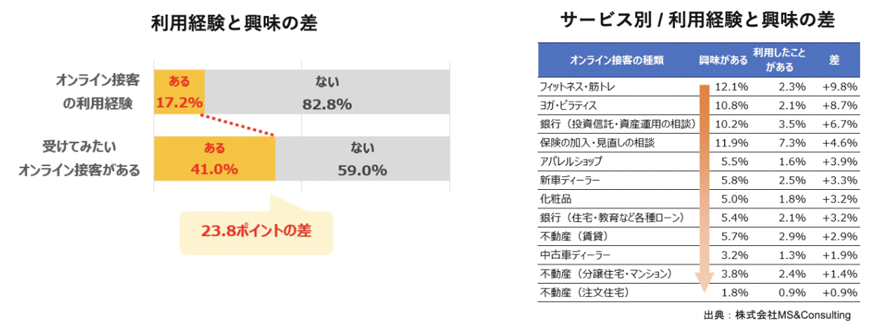オンライン接客に「興味がある人」は「利用したことがある人」の約2倍であり、認知度や利用のしやすさを高め、利用者のすそ野を広げることが期待できます。 サービス別に見ていくと「フィットネス・筋トレ」「ヨガ・ピラティス」が利用経験と興味の差が大きく、次いで先ほどのアンケートで利用率が高かった「保険の加入・見直しの相談」「銀行(投資信託・資産運用の相談)」がランクインしています。 ポイントの差が大きいことも重要ですが、既存で稼働しているのにもかかわらず、依然としてニーズが高くなっているサービスはより多くの顧客に使われる可能性を秘めています。