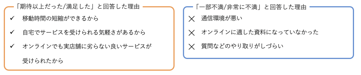 導入の背景でもあったように、顧客の接客までの負担が少ないのがオンライン接客のメリットとして大きいですが、アンケート結果からもそれを利便性が高いように感じていただいているようです。 不満と感じた方の意見は「通信環境が悪い」「オンライン接客に適さない接客だった」とツールの機能性や担当するスタッフの段取りが影響していることが表れています。