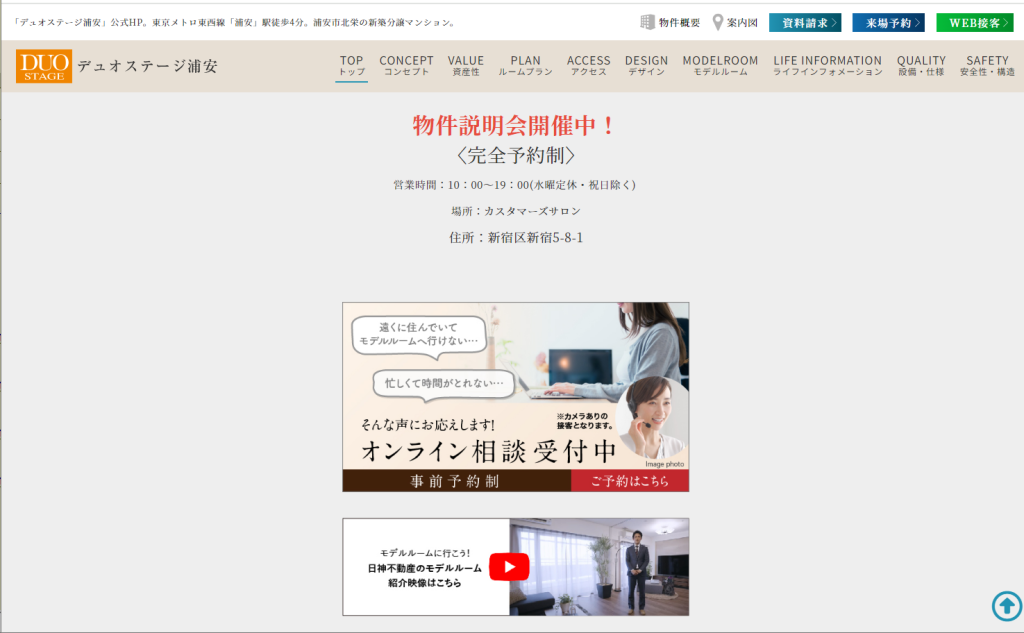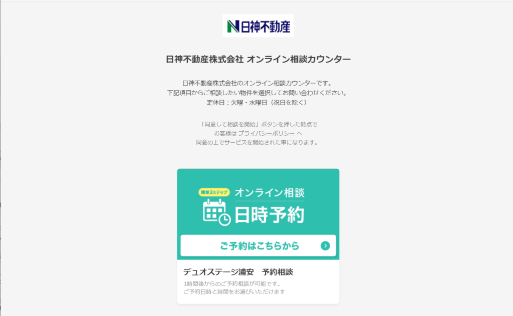 日神不動産株式会社様の物件のページにオンライン相談へのボタンやバナーが設置されており、